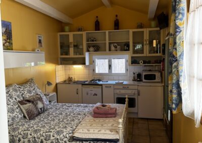 With only 2 rooms, the main room contains the double bed, a galley-style kitchenette at one end complete with sink, under-bench fridge with small freezer, 2 gas ring hobs, built-in oven, microwave, toaster, coffee maker, electric jug and a Flat-screen TV with French Channels Only.